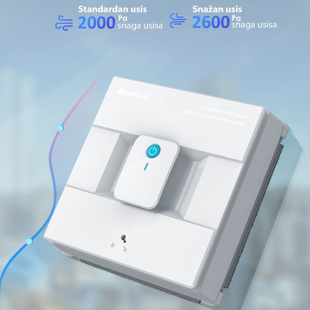 u zavisnosti od nivoa prljavštine na staklenoj površini. Može automatski da menja snagu usisa prema uslovima rada i da se dodatno zaštiti jačim usisavanjem kada prelazi preko ivica bezramnog stakla.